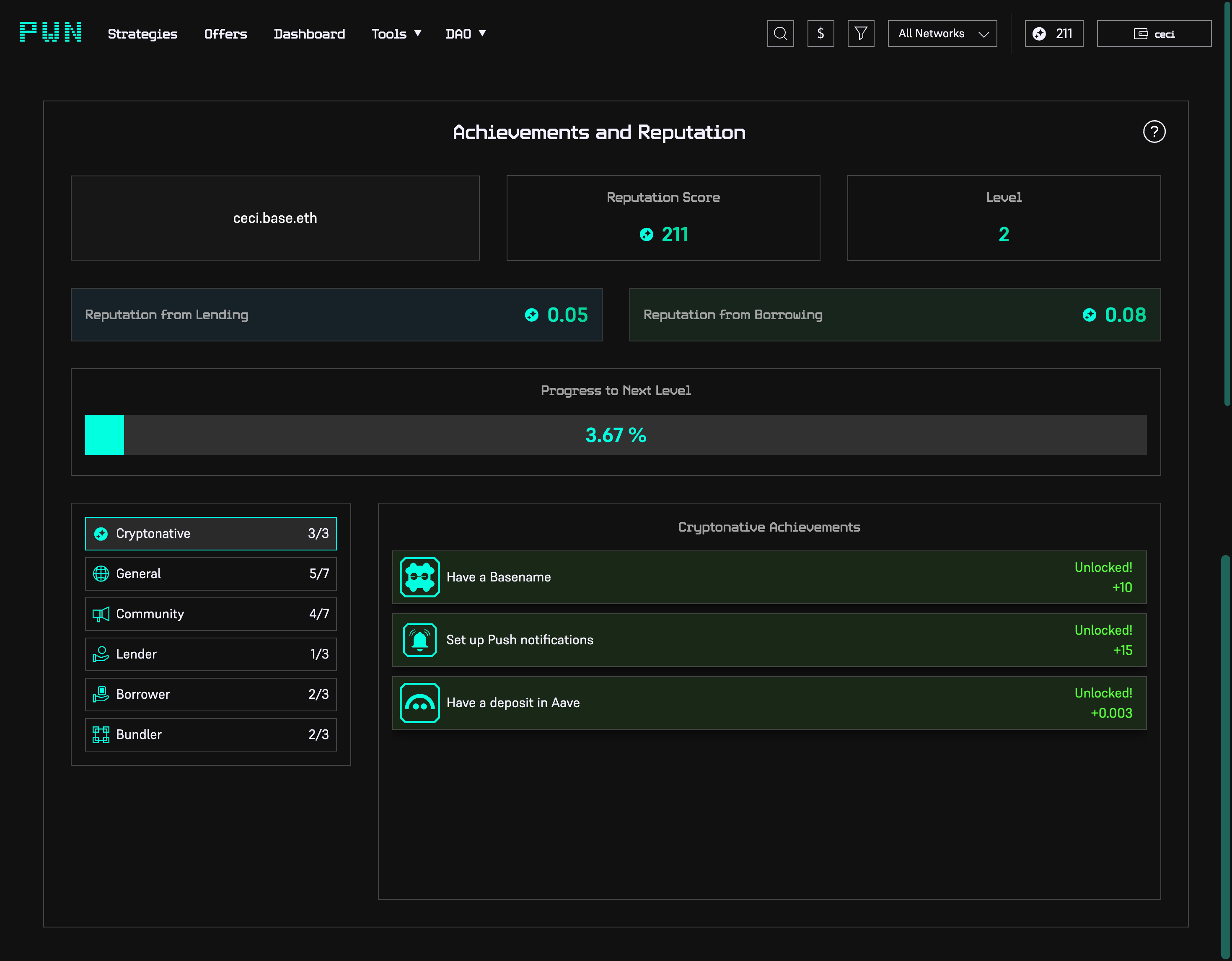 Achievements consist of regular or one-time tasks that allow you to earn additional reps. They are categorized into different groups, such as Community, Lender, Borrower, and more.