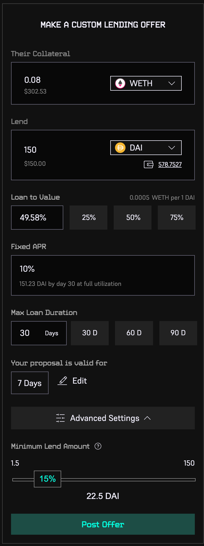 After you select their collateral and/or lent asset, the app will automatically push all matching borrowing proposals in the "I want to lend" module on the left. If one fits your terms, just click on the "Lend" button.