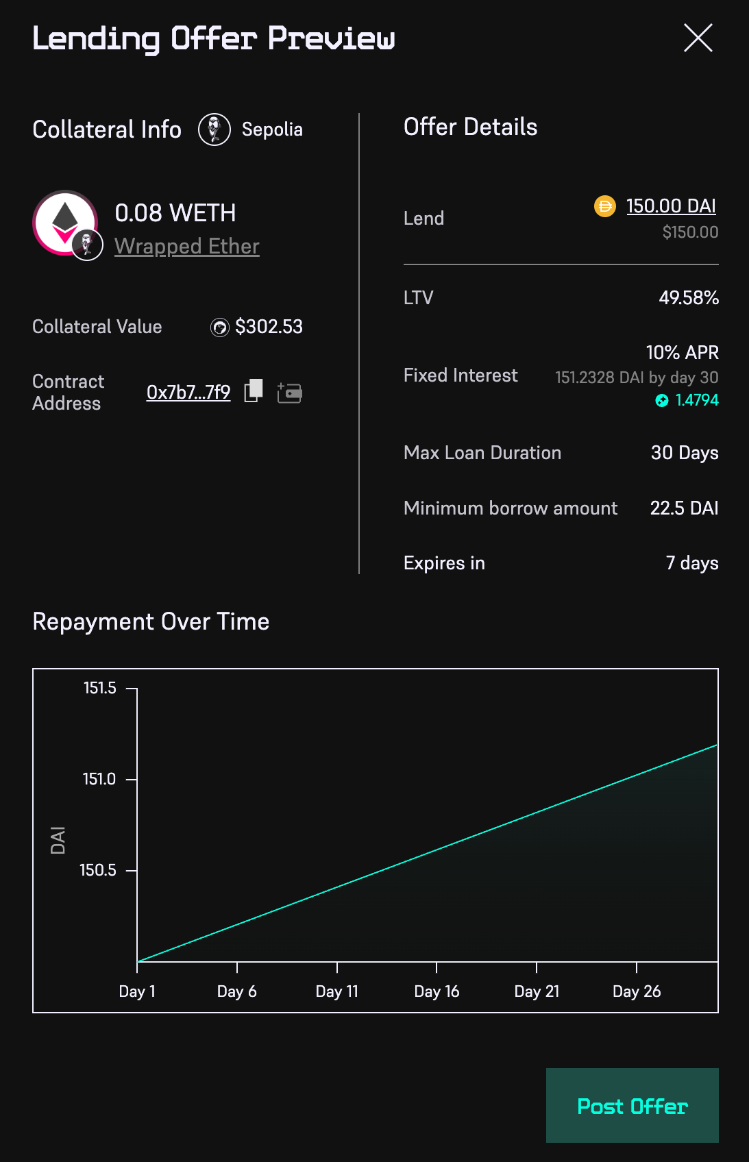 ⚠️ The lent asset won't leave your wallet until your lending offer gets accepted or you accept a borrowing offer. Make sure it remains available until your offer expires or it will be invalid.